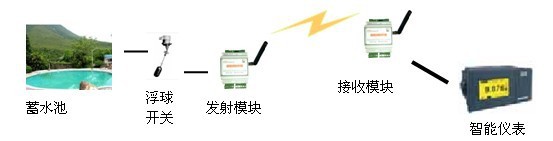 本方案的核心控制器是DTD110系列无线开关、模拟量产品,在蓄水池中安装水位开关,用一个DTD110H发射模块实现水位的报警检测,当水位开关超过设置水位时将开关量传输到DTD110H接收模块上,或者用DTD110F发射模块实现动态模拟量检测,传输到110F接收模块,接收模块连接智能仪表直接显示所需数据。
