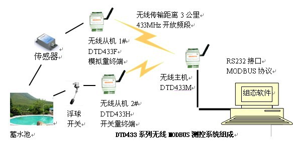 开关量传输到DTD433M终端上,或者用DTD433F实现动态模拟量检测,同样传输到433M终端上,再由433M与组态软件、人机界面相连,直观的显示液位状态。